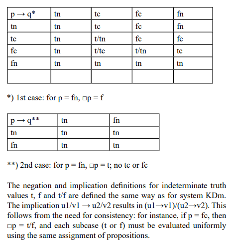 The definitions for negation and implication involving indeterminate and mixed (determinate and indeterminate) truth values can be derived from the implication table for determinate values provided above. Simply apply all corresponding columns for an indeterminate truth value (e.g., tn and tc for t). The resulting tables for indeterminate values t and f are the same as in classical bivalent logic.