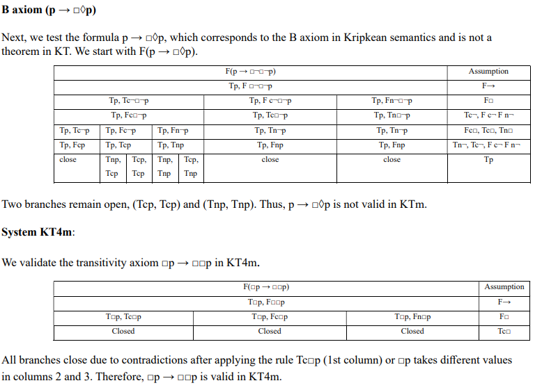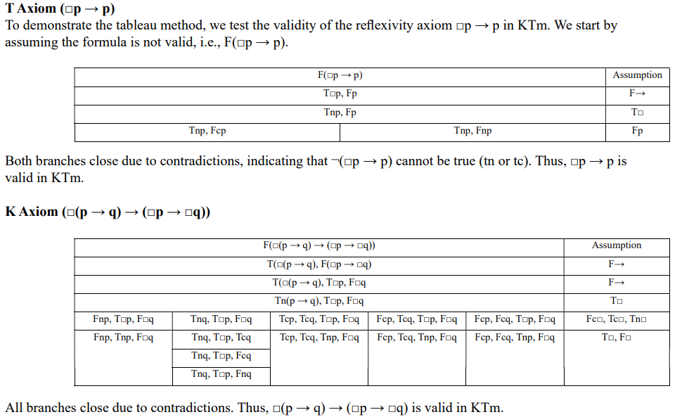 The tableau method, a classical tool in propositional logic for testing validity, systematically decomposes formulas into their subformulas to determine if a contradiction arises under all possible truth assignments [2, 10]. In Resolution Matrix Semantics (RMS), we adapt this approach to modal contexts by leveraging the finite set of truth values—necessary truth (tn), contingent truth (tc), contingent false (fc), and necessary false (fn)—alongside indeterminate values (t, f, t/f). A formula A is valid in an RMS system if its negation ¬A cannot be assigned a "true" value (tn or t) in any interpretation, meaning every branch of the tableau closes (i.e., contains a contradiction). This section outlines the tableau method for RMS and provides examples for the system KTm, illustrating cases where a formula is a theorem (valid) and where it is not.