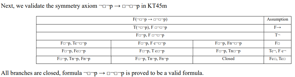 This tableau tree also has all branches close; therefore, axiom K is valid in KDm.