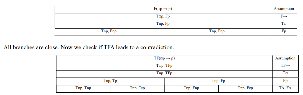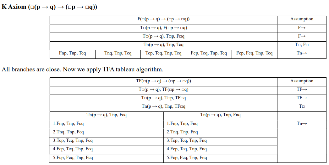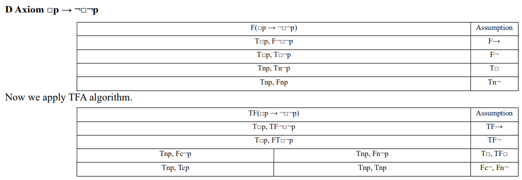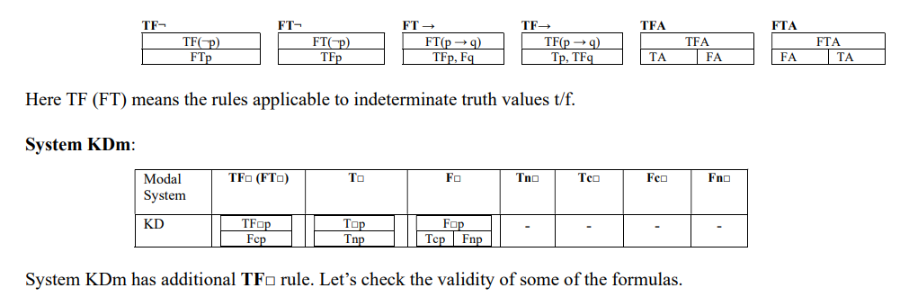 Now let’s examine systems KDm and Km. Both incorporate an additional truth value, t/f (“fully indeterminate”). As in previous systems, to determine if a formula A is valid, we apply the FA rule, which results in either all branches closing or at least one branch remaining open. Additionally, we must assume that formula A takes the fully indeterminate value t/f and apply all decomposition rules to check whether this assumption leads to a contradiction. Therefore, for systems KDm and Km, we use two algorithms: FA and TFA. For A to be valid, all branches in both tableau trees must close.