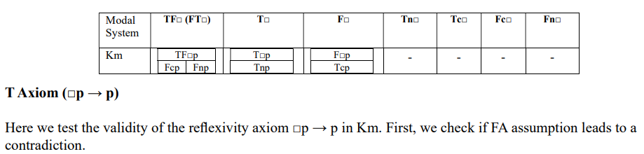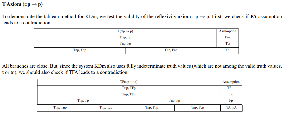 One of the branches, (Tnp, Tnp) remains open, therefore, axiom T can take the value t/f, this is not one of the values for the valid formula (t or tn), therefore this axiom is not valid in system KDm.