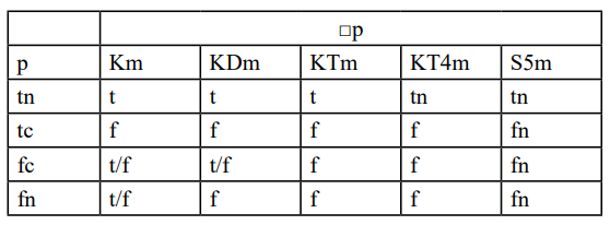 • Km has the most indeterminate values (t, f, t/f), with t/f for fc and fn, reflecting its lack of relational constraints.