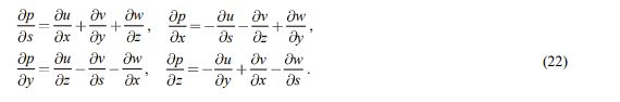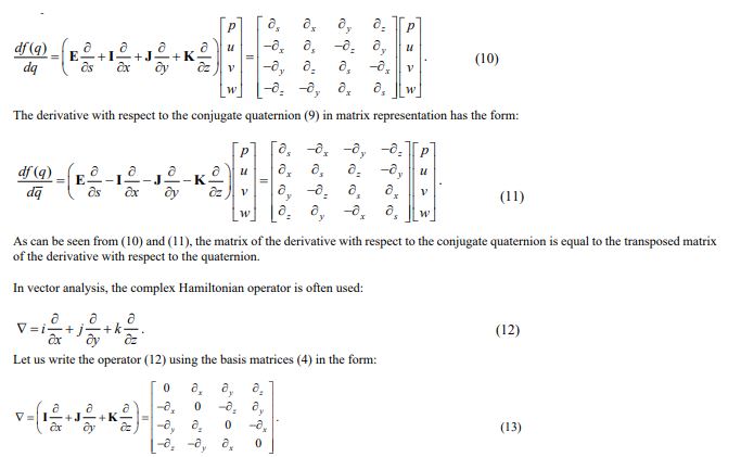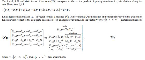In expression (28), the notations for time derivatives retain the indices denoting the coordinate axes s, x, y, z in the matrix representation and showing that time derivatives are taken from complex functions. In the representations of functions from the quaternion p, u, v, w, time indices are absent and are implied by default. It is also necessary to remember that f (q) is a function of time.