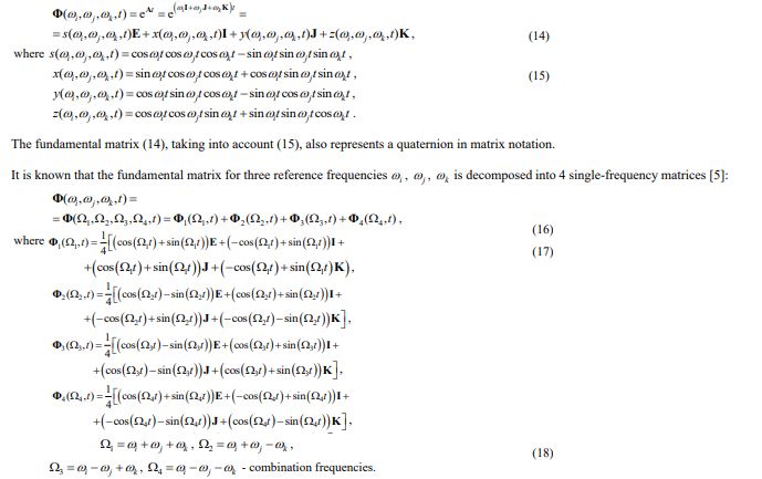 Thus, the quaternion space has a dimension of 4D. In this case, three coordinates are imaginary and one is real. For harmonic functions sine and cosine with different angular frequencies, each imaginary coordinate has its own angular frequency and a connection between time (rotation frequency) and space is formed. The STM for a dynamic state-space model is a differential operator and corresponds to the Hamiltonian operator. For harmonic functions, spatial differentiation corresponds to multiplying the elements of the quaternion by the angular frequencies of the corresponding spatial coordinate axes. The three-frequency fundamental matrix is a solution to the differential equation of dynamics in the state space. The three-frequency fundamental matrix for three reference frequencies is orthogonal and is decomposed into the sum (16) single-frequency orthogonal matrices (17) of combination frequencies (18).