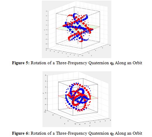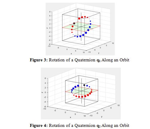 Figure 3 shows the orbit of a single-frequency quaternion for the initial state q1 = [ 5 -2 -3 2]T corresponding to Figure 1. The initial state is depicted as a sphere with black surface lines. Figure 4 shows the orbit for the initial state q2 = [ -3 2 -1 3]T shown in Figure 2.