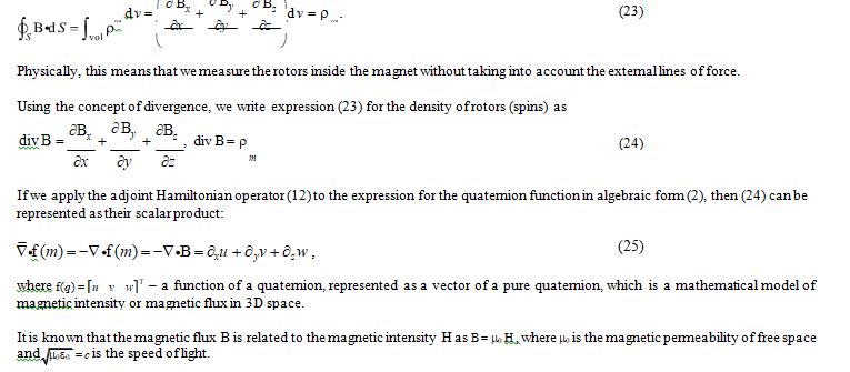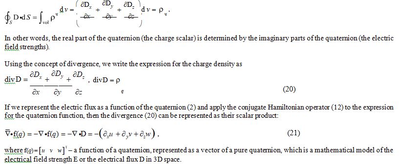 It is known that D = é 0E , where é 0 is the permittivity of free space (electric constant) [1]. As can be seen from (21) and in accordance with Gauss's law, the charge is determined by the vectors of electrical intensity. When representing the electric field as quaternions, the strength E and the electric flux D are three-dimensional vectors in 3D and represent the imaginary part of the quaternion. This indicates that the charge or charge density of electrons in this representation is formed by electromagnetic waves and has a corresponding spectrum. According to the terminology of classical electrodynamics, such charges form “eddy” currents. However, charges can be formed by summing charges, in the form of scalars, and form "electric currents". Consequently, charge, as a scalar quantity, together with vector values of electrical intensity, exists not in 3D, but at least in 4D space.