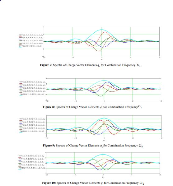 The spectra in Figures 7-10 show how the magnitude of the scalar part of the electron (red lines) and the magnitude of the imaginary parts (blue, green and brown lines) change depending on the change in combination frequencies (18): Parseval's equality holds for quaternion spectra.W1, W2, W3, W4. Note that Parseval's equality holds for quaternion spectra.