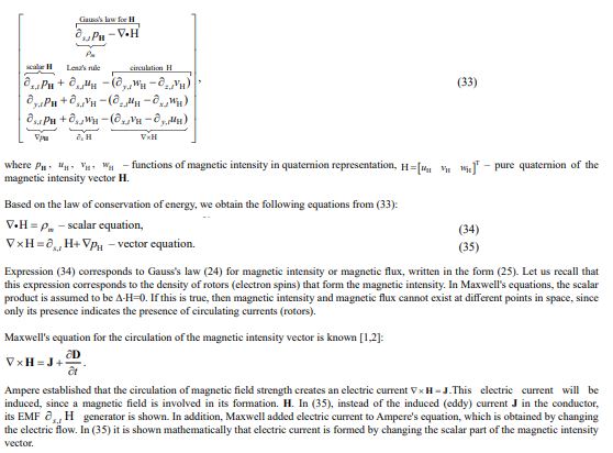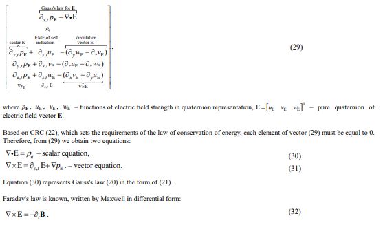 In the resulting representation (31), instead of the time-varying magnetic flux ï?¶t B, EMF ï?¶s,t E is written, which creates a current in a closed circuit. As can be seen from expression (31), EMF ï?¶s,t E is proportional to circulation ï?? ï?´ E and is subtracted from it to obtain zero energy increment. In expression (31), in contrast to Maxwell’s equation, there is an additional term ï??pE – the vector of derivatives of the scalar part of the electrical field strength along the imaginary coordinate axes in matrix representation. This is explained by the fact that Maxwell's equations are written for 3D space and, when represented in quaternion form, do not take into account the scalar part. The increment of the scalar part of the field strength vector along the imaginary coordinates, together with the increment of the electric field strength vector of the imaginary part, must compensate for the increment of circulation so that their sum is equal to zero, and the energy of the electric field strength vector in the quaternion representation is preserved.