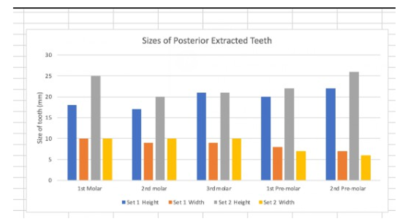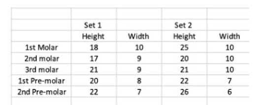 The teeth were collected from extracted teeth at the Detroit Mercy Dental School. A periodontal probe was used to measure the width and height of each tooth in millimeters.