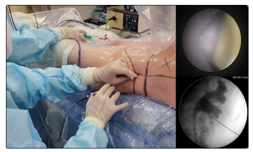 Figure 2: Kidney is punctured using “all-seeing needle” under combined X-ray and direct endoscopic control.