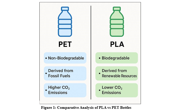 The comparative examination of polyethylene terephthalate (PET) and polylactic acid (PLA) bottles, based on life cycle assessment(LCA) methodology and empirical environmental performance measures, demonstrates a clear set of benefits associated with PLA use. PET is highly prized for its mechanical strength and clarity, but it has substantial environmental downsides, notably in terms of greenhouse gas emissions and microplastic leaching [19]. According to LCA studies, PET bottles emit 5.09 kg COâ??- equivalent per kilogramme of material during their life cycle [22]. Furthermore, during use and deterioration, PET bottles are prone to fragmentation into micro- and nanoplastics, which can persist in aquatic systems and pose dangers to human and environmental health.