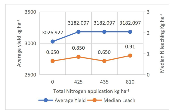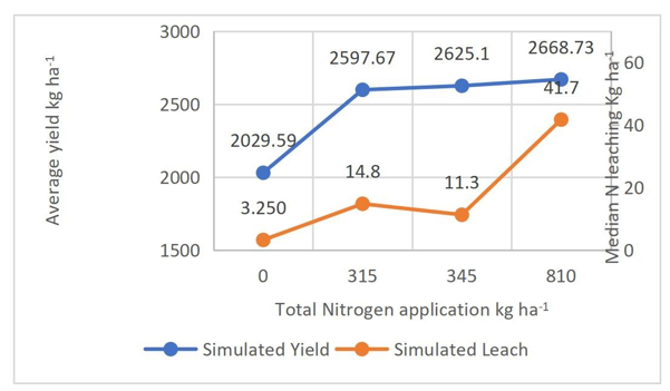 Simulation results suggested that modest increases in total nitrogen inputs up to 345 kg N ha-¹ for Maha and 435 kg N ha-¹ for Yala could slightly improve yields up to 2625.10 kg ha-¹ in Maha and 3174.46 kg ha-¹ in Yala, while decreasing leaching losses in Maha to 11.3 kg ha-¹, and maintaining relatively constant minimal leaching level in Yala. This indicates potential to enhance nitrogen use efficiency for present climate conditions through optimized application rates, particularly in the Maha season. In 2050 climate scenario, nitrogen application for the Maha season remained the same as in the present evaluation at 345 kg ha-1, yielding 2650.03 kg ha-1, while leaching losses increased to 13.75 kg ha-1 due to projected climate variability (Fig.3). For the Yala season, total nitrogen remained 435 kg ha-1, with a yield increase to 3182.09 kg ha-1 and leaching losses rising slightly to 0.65 kg ha-1 (Fig.4). The summary analysis of the 2050 scenario suggested that slightly higher yield than the present, however with a cost of increased nitrogen leaching in both seasons.