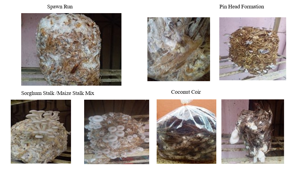 Days for completion of spawn running. Time was recorded in days for the completion of 100 per cent growth of mycelium on each substrate in polythene bags. Days for the appearances of pinhead: The data were recorded in days taken for appearance of mushroom primordial formation in substrates. Maturation of fruiting bodies: Time period was recorded in days from pinheads to maturation of fruiting bodies in all treatments. Yield: The data were recorded for the harvesting of mushroom up to three flush- es. The first and respective harvesting was done at maturity and the yield of different flushes of fruiting bodies was noted.