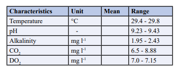 The physico-chemical parameters of the test water used for sub-le- thal concentration for 5weeks were shown in table 1. The tempera- ture ranged from 29.4to29.8°C,pH ranged from 9.23 to9.43, Alka- linity ranged from 1.95 to 2.43, CO2ranged from 6.5 to 8.88mg/L, DO2 ranged from 7.0 to 7.15mg/L.