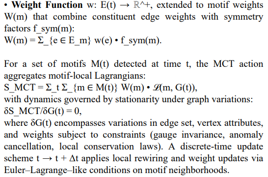 MCT encodes these sectors by assigning interaction-type labels κ_e and couplings g_e to edges and by embedding local Lagrangian densities into motif weights W(m). Gauge invariance and anomaly cancellation are enforced by rejecting rewiring proposals that violate local conservation of quantum numbers and by motif-level checks of triangle anomalies.
