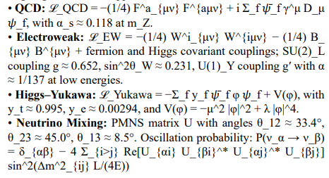 • Couplings: α_s ≈ 0.118 (at m_Z), α ≈ 1/137 (low energy), y_t ≈ 0.995, sin^2θ_W ≈ 0.231.