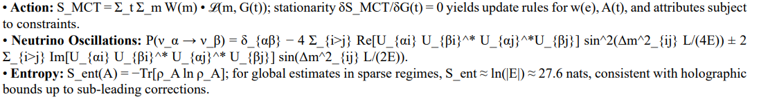• Edge Attributes a_e(t): interaction type κ_e ∈ {QCD, EW, Yukawa, graviton, darkphoton, spin-foam}, coupling g_e, and LQG face spins j_f (for spin-foam edges). Edges may be directed or undirected depending on interaction and conserve charges at endpoints.
