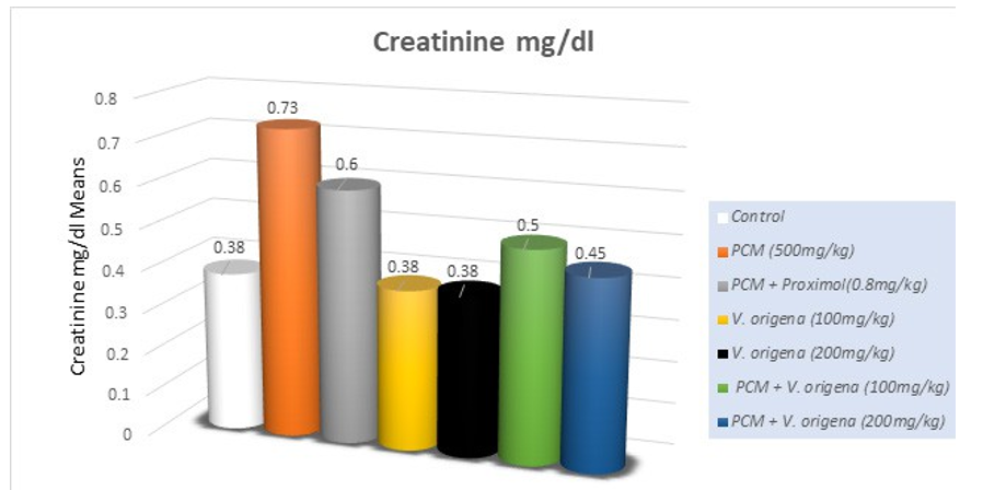 Figure 2: Effect of PCM and V. origena Extract on Creatinine Levels (mg/dl) in PCM- Induced Nephrotoxicity in Guinea Pigs