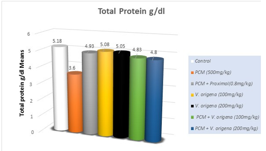 Figure 3: Effect of PCM and V. origena Extract on Total Protein (g/dl) in PCM- Induced Nephrotoxicity in Guinea Pigs