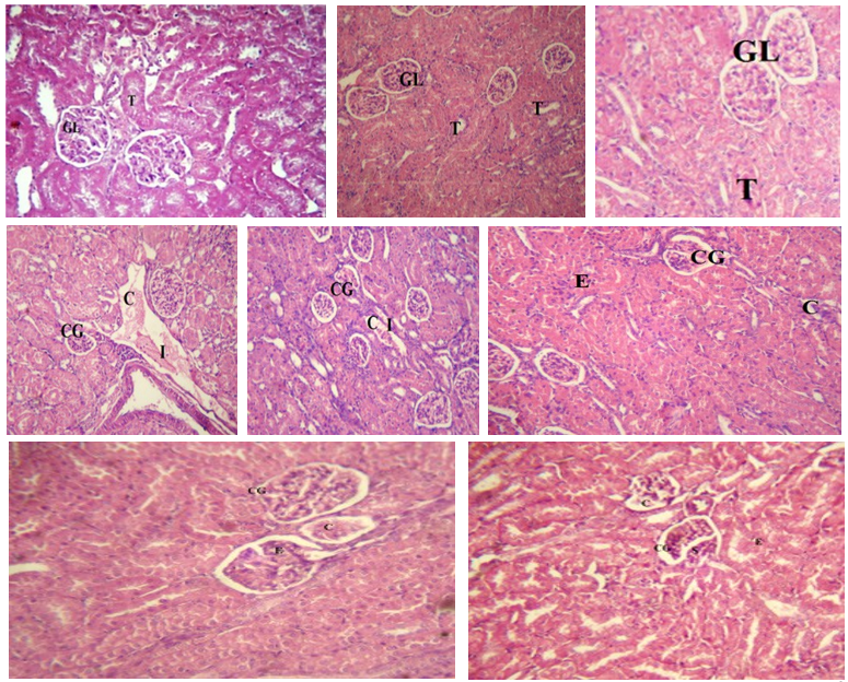(a) Control group given distilled water for ten days showed normal kidney architecture(H&E×100), (b and c) group given V. origena (100 and 200 mg/kg) showed the normal appearance of glomerulus (GL) and renal tubules (T) (H&E×100), (d and e) PCM intoxicated kidney tissue showed shrinking and congestion of the glomerular tuft (CG), renal tubules and renal blood vessels (C) as well as interlobular blood capillaries. Also, mononuclear leukocytic infiltration(I), (f) effect of Proximol treatment on PCM intoxicated kidney tissue showing little congestion and shrinkage of some of the renal glomeruli (CG) and renal tubules (C). The glomeruli show presence of eosinophilic (E)debris in the glomerular space, (g) effect of 100 mg/kg V. origena treatment on PCM intoxicated kidney tissue showing little congestion and shrinkage of some of the renal glomeruli (CG) and renal tubules (C). The glomeruli show presence of eosinophilic (E)debris in the glomerular space, (h) effect of 200 mg/kg V. origena treatment on PCM intoxicated kidney tissue showing little congestion and shrinkage of some of the renal glomeruli (CG) and renal tubules (C). The glomeruli show presence of eosinophilic (E)debris in the glomerular space