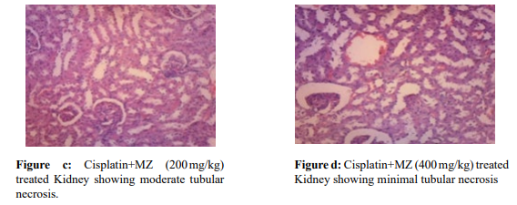 Histopathological slides of the normal group, Cisplatin alone group, and two used dosages of CP and MZ are presented in Fig 1. The kidney tissue of normal rats showed no visible signs of degeneration or necrosis and was previously confirmed from biochemical and antioxidant results (Fig. a). Extensive kidney tissue degeneration along with tubular necrosis was noted in the CP alone-treated rats (Fig. b). The rats which received 200 mg/ kg optimal Hydroalcoholic extract of Manikara zapota showed a tubular pattern through reasonable necrosis and degranulation (Fig. c), whereas the rats which received 400 mg/kg Hydroalcoholic extract of Manikara zapota exhibited very minimal swelling, necrosis, and cellular desquamation (Fig. d).