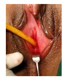 The proximal corpora were closed with 4–0 Vicryl for haemosta- sis. The base of the glans was sutured to the divided proximal cor- pora with 4–0 Vicryl interrupted sutures. After haemostasis was confirmed, the skin was closed with 4–0 vicryl interrupted sutures to re-approximate the labia minor and the clitoris