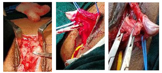 The dorsal neurovascular bundle was isolated and lifted off the phallic shaft using a vascular loop. Ventral urogenital tissue was isolated and secured with a vessel loop, and vessel loop previously placed around the base of the phallic shaft as a tourniquet was tightened to minimize bleeding. The dissection was carried proxi- mally to the bifurcation of the corpora. The two crura were identi- fied, clamped and the mid body of the corpora resected.