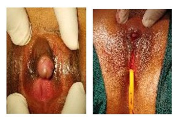 On clinical examination the patient had hirsutism on the face (up- per lips) and had a masculine look. Height was stunted for age 142cm, axillary pubic hair growth, breast bud was present but not developed was present. Genital examination revealed a phallus measuring 4cm, urethra not visualized, vaginal opening seen.