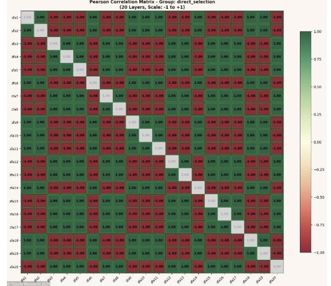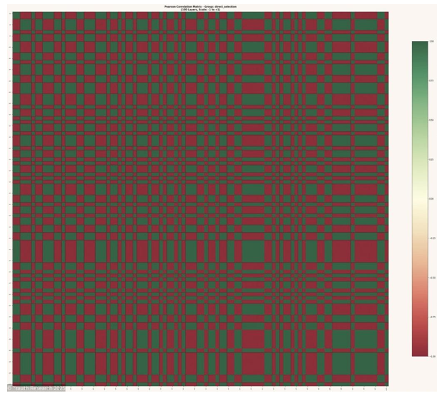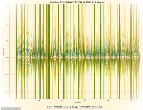 The geometry observed in the Pearson matrices, the stability of ±1 correlation structures, and the emergence of global synchronization events across more than 500 iterations all indicate that the network does not perform incremental optimization but rather establishes a global informational manifold in which the ground state corresponds to a uniquely stable attractor.