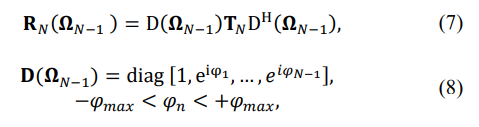 where |tn|, n = 1, …, N − 1 are the true moduli of the covariance matrix elements, we distribute the sign inversions using the simple “maximum element” algorithm. At each step of this algorithm, all unoccupied positions by the sign change of the positive covariance lag moduli are tested, and the position where the sign inversion leads to the best criterion result is accepted. In ref. this algorithm was successfully applied for noise mitigation at the output of the antenna array with the integer phase control of the antenna's phase shifters [18].