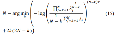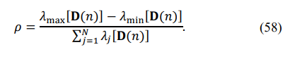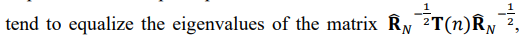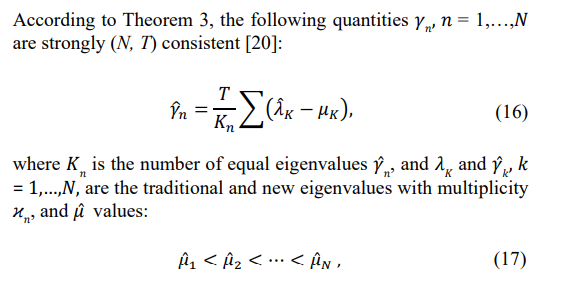 leads to an increased dynamic range of the sample matrix eigenvalues compared with the eigenvalues of the true covariance matrix [19]. Moreover, the typical spatial covariance matrices, where adaptive/optimum processing can provide significant signal-to-noise ratio improvement, have several identical minimal eigenvalues equal to the external white noise power. In examples (10) and (11), the true matrix TN has eleven identical minimal eigenvalues equal to the white noise power (see table 1.). Therefore, the number of “noise subspace” eigenvalues has to be estimated using the Minimum Description Length or Akaike Information criterion. According to the MDL criterion, the number of noise subspace eigenvalues is equal to: