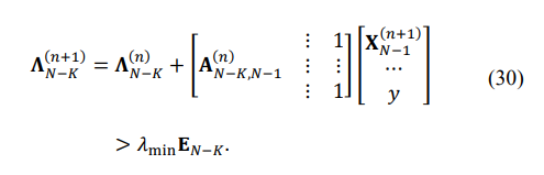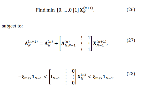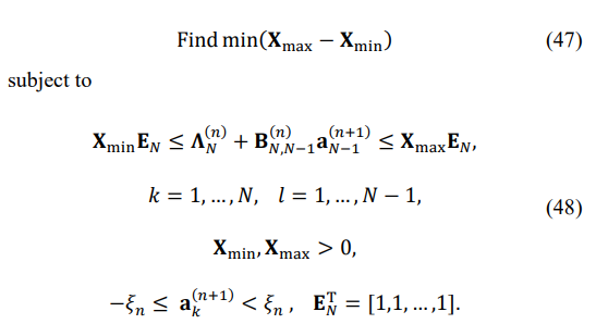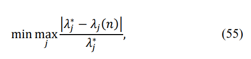 where Uj(n) is the j-th eigenvector of the matrix TN(n) . Keeping the first-order eigenvalue expansion accurate is critically important, and therefore, after each n-th step of the iterative matrix estimation, the matrix has to be reconstructed using (19), the standard routine for eigenvalues calculations applied with the result compared to the LP solution. Otherwise, the ![]()