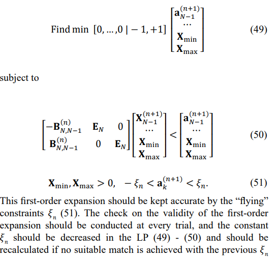 For linear programming to be applied, the iterative representation of the eigenvalues of the updated matrix TN(n+1) should also be linear, meaning the first-order eigenvalue expansion should be sufficiently accurate. That is possible only for a very small innovation tk(n+1) at each step of the iterative representation.