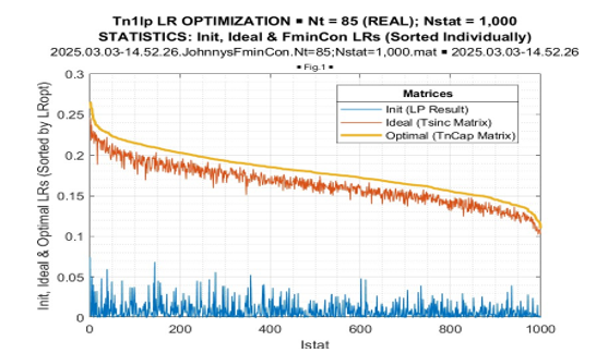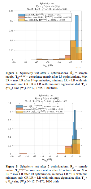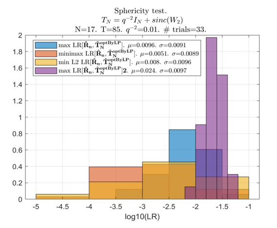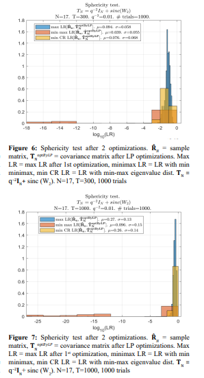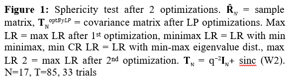 The most important result is Fig. 11. Here, the results of LR optimization for T = 85 are presented in declining order over 1000 conducted trials. Then, for each optimized LR value, we introduce the corresponding “expected” LR value of the true covariance matrix LR[TN] and the LR value of the initial Toeplitz matrix.