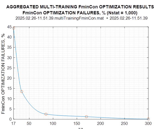 In what follows, we report on the probability of the fmincon failure as a function of the training sample volume T. Still, the need to decrease the probability of convergence to a (legitimate) local LR extremum did not exist throughout all conducted simulations.