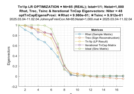 Yet, in this study, we use the derived moduli and eigenvalues of the Toeplitz matrices as the initial solutions for the search for the global likelihood ratio (LR) maximum. Before application of the MATLAB fmincon routine for the final LR maximization, we introduce the linear programming (LP) routine that modifies the estimated Toeplitz matrix in an attempt to equalize the eigenvalues of the product of the inverted Toeplitz and direct sample matrices. While fmincon can operate directly with the “moduli and eigenvalues” solutions, this LP step may be final, delivered by the convex routine, if the global LR maximum is not required.