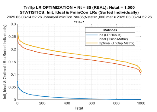 Let us analyze the results of the MATLAB fmincon likelihood ratio maximization using the solutions of the “moduli and eigenvalues” LR optimization as the initial solutions for the fmincon optimization.