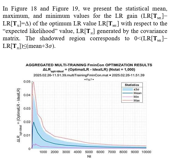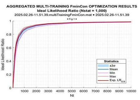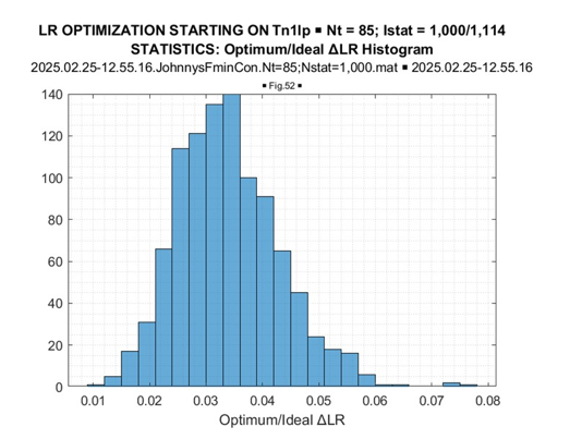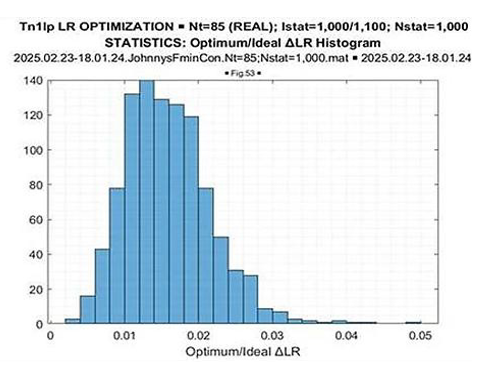 The most important “take away” from these figures is the greater than the “expected likelihood” results of the fmincon LR optimization in every conducted trial. The LR “gain,” achieved by LR maximization concerning the “expected likelihood” LR[TN], is approximately the same for all trials. More details on this “gain” are provided by its distribution, presented in Figure 13.