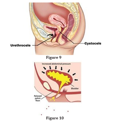 The main causes of SUI include pregnancy, vaginal delivery and pelvic floor muscles weakening, which in turn cause pelvic organs to prolapse. When the bladder prolapses (cystocele) it stretches, widens, and kinks the urethra, which leads to distortion of the ure-thral sphincters and renders them incompetent (Figure 9).