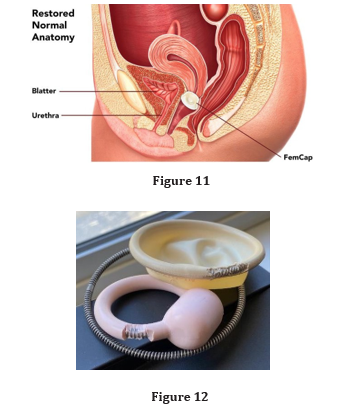 Stress urinary incontinence (SUI) is prevalent among women of all ages, particularly menopausal women. SUI is under-reported by women as well as under-diagnosed and treated by doctors. A woman using the FemCap for contraception reported that she had suffered from stress urinary incontinence, but when using the Fem-Cap (Figure 1,2,3), her SUI subsided [1-8]. Thankfully, she shared her experience, which led me to investigate a new usage for the FemCap as an SUI pessary called FemContinence. The first line of treatment for SUI is pelvic floor muscle Kegel exercises and vaginal pessaries (Figure 4,5,6,7). The most popular is the ring pessary (Figure 5), however, a variety of shapes and sizes are now becoming available in hopes of achieving better results (Figure 6, 7). [9-10].