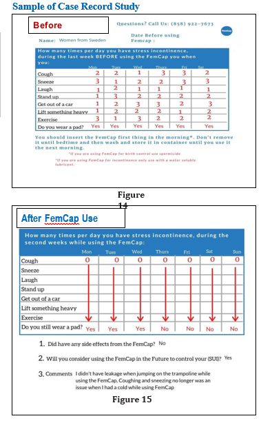 Materials and Methods: The FemCap combines the features of the ring and space- occupying pessaries into one device, which makes it more successful. The Bowl of the Dome of the FemCap covers the cervix and prevents it from prolapsing. The Rim fits snugly into the vaginal fornices that supports the bladder neck. The Brim flares outward pushing against the cystocele and urethrocele anteriorly to restore the anatomy of the urethra and the bladder. We recruited 118 women who had significant SUI and asked them to compare their experience for one week before using the FemCap and one week after. The FemCap was self-inserted and removed by the participants.