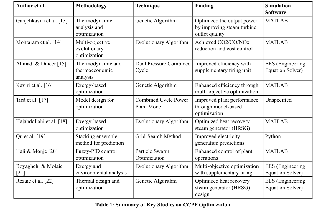 CCPPs have been the focus of study, with considerable research interest in improving efficiency, reducing emissions, and reducing the reducing the cost of operation. A variety of efforts have been made to meet these aims, utilizing a multitude of optimization methodologies and analytic processes.