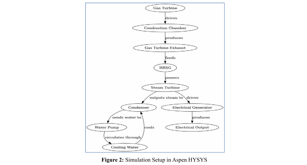 In this study, a new CCPP model is created, and subsequently, the software Aspen HYSYS, a suitable process simulator, is applied. HYSYS of Aspen provides a tremendous chance in the area of the thermodynamic characteristics of every component and their interactions in the CCPP. The use of the program allows for the study of the specified power plant performance metrics as well as strategies of operation and design of the system. Key Parameters Temperature and Pressure Levels: The efficiency of the CCPP is therefore impacted, particularly by the operating temperatures and pressures of the gas turbine, HRSG, and steam turbine. In most applications, a rise in temperature and pressure raises the performance rating. Fuel Type and Quality: The type and standard of the fuel being utilized in the gas turbine may, in a substantial manner, impact the efficiency and emissions of the power plant. Some of the enhancement fluids used are: Natural gas is the most utilized enhancement fluid since it is efficient and favorable to the environment. Heat Recovery Efficiency: The degree of efficiency with which the HRSG is employed to recover and expel the waste heat generated by the gas turbine is one of the most critical components of CCPP performance. The model of a combined cycle power plant that has been utilized in this research integrates advanced heat-to-work conversion technology with simulation approaches to boost generating systems. In this manner, the CCPP takes the best from both gas and steam turbines to create the most efficient and ecologically friendly alternative for contemporary power production. Simulation Setup in Aspen HYSYS Setting up a simulation in Aspen HYSYS for optimizing a combined cycle power plant (CCPP) involves several detailed steps. This section outlines the comprehensive process, including the parameters and assumptions used.