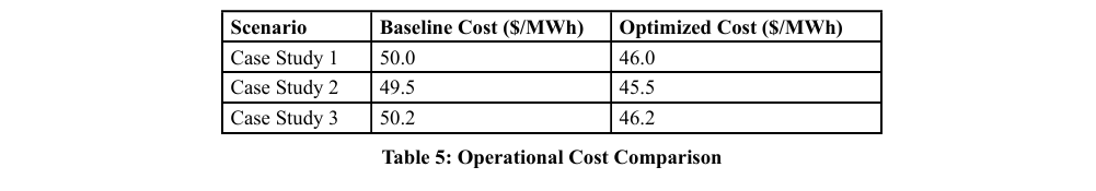 Operational cost analysis showed that optimization led to considerable cost savings. Table 5 and Figure 7 present the cost analysis for the baseline and optimized scenarios.