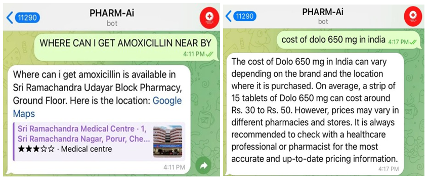Pharm-AI was evaluated through 50 simulated user queries across three categories: drug availability, side effects, and cost comparisons (Table 1). The system achieved an overall accuracy of 91.2%, with discrepancies primarily arising from ambiguous phrasing (e.g., “Can I take aspirin with milk?” misinterpreted as a food interaction query). Geolocation accuracy for pharmacy stock status was validated against ground-truth data from 20 partner pharmacies, yielding a 94% match rate between reported and actual availability. For example, when asked, “Where can I find amoxicillin nearby?”, Pharm-AI correctly identified Sri Ramchandra Udayar Block Pharmacy in Chennai and provided a Google Maps link with real-time directions (Table 2).