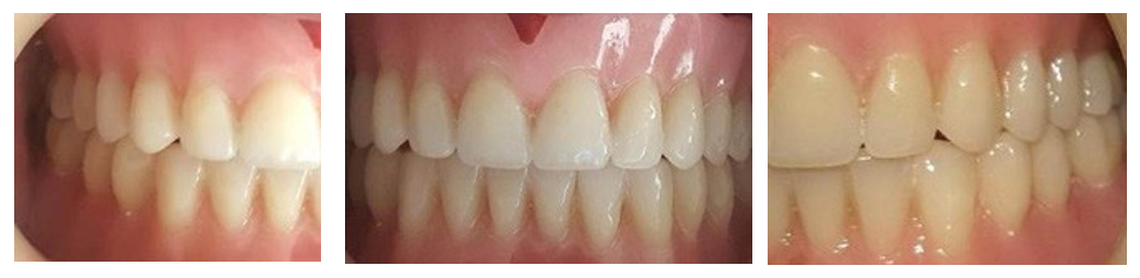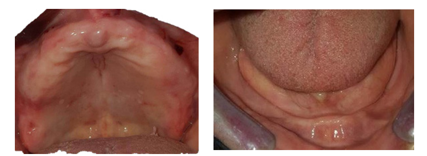 The occlusal examination shows a pseudoprognathism because of the two arches' distinct resorptions: centripetal in the maxilla and centrifugal in the mandible (Figure 3).