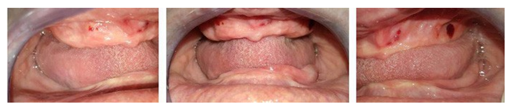 The intraoral examination reveals a toothless maxillary crest adequate in width and height (Classe I Sangiuolo). At the opposit, the mandibule is terminally resorbed (classe III) (Figure 2).