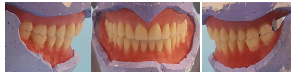 After fitting the teeth on wax (Figure 10), the prostheses were polymerized then placed in the mouth with a minimum of edge trimming and occlusal balancing. The patient was satisfied with the result. A post-prosthetic maintenance program was then set following consultation with the patient.