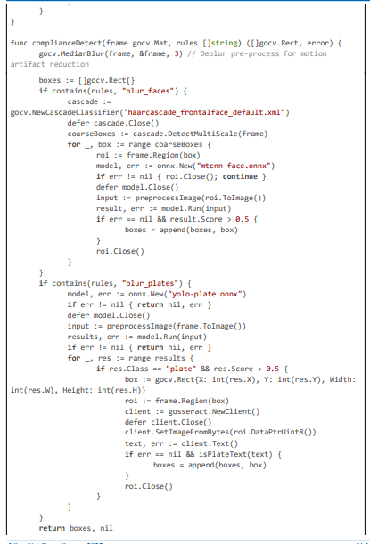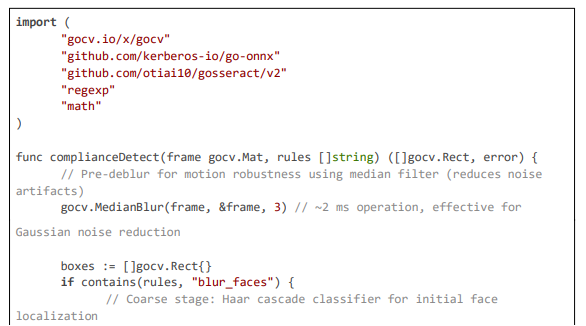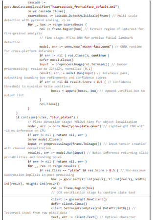Anonymization uses SHA-256 hashing for logs, TLS for secure communications, and Redis for rule caching to minimize database hits. NVML enables GPU acceleration for sub-5 ms inference, while Prometheus gauges track latency and cost for auto-scaling. Below, we detail the implementation across core modules, with large code excerpts highlighting the logic for geolocation enforcement, motion- adaptive analysis, and multi-stage detection with blurring.