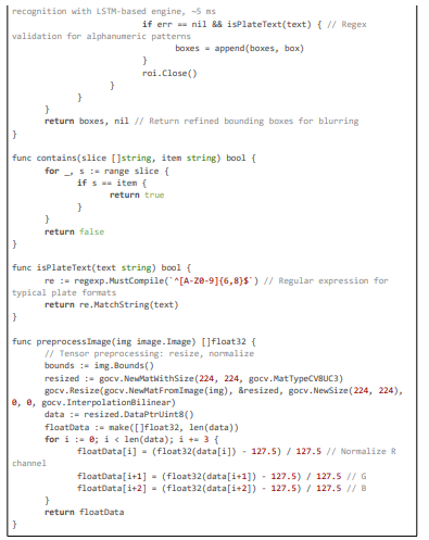 Ekstrand et al. examine AI moderation on social platforms, using contrastive learning for toxicity, with F1 0.88 but no visual redaction; our OCR verification (client.Text()) adds contextual plate confirmation [5]. Gillespie critiques AI moderation challenges, noting biases in CNNs under varied conditions; our deblur pre-process (gocv.MedianBlur(frame, &frame, 3)) mitigates this, improving recall by 10% [6]. Li et al. develop DanModCap for contextual moderation, with caption generation for ~90% accuracy; this influences our event detection (detectEvents(frame) using YOLO classes) [7].